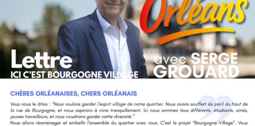 Une campagne municipale est l’occasion de faire des propositions. Serge Grouard en a adressées plusieurs qui concernent nos quartiers, dont vous avez été destinataires il y a quelques semaines. Notre association compte bien être vigilante quant à leur réalisation et accompagner leur mise en œuvre. BOURGOGNE VILLAGE COMMERCE PATRIMOINE SÉCURITÉ URBANISME CADRE DE VIE MOBILITÉ